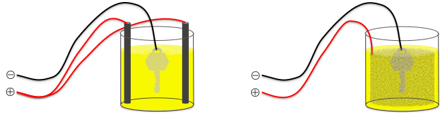 - Il faut un récipient en verre assez grand pour pouvoir y tremper l'objet (qui constitue la cathode) et placer les électrodes en graphite ou en or (qui constituent l'anode). Schémas de montages possibles :