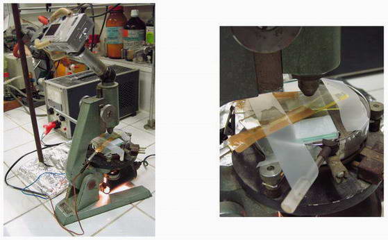 - On découpe dans une feuille de laiton de petites lamelles assez longues, qui nous serviront à réaliser les contacts entre la source de courant et la plaque de verre.