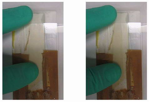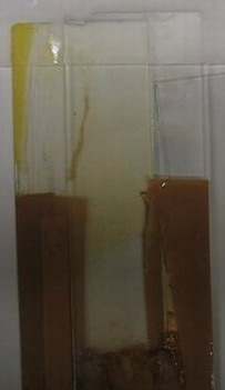- A l’aide de pinces métalliques, les plaques sont retirées et la plaque centrale rendue conductrice est placée sur de la laine de verre où elle refroidira lentement (le refroidissement directement sur la plaque métallique pouvant conduire au bris du verre. Une fois refroidie, on obtient une plaque de verre transparente, recouverte d’une couche d’oxyde d’étain iridescente.