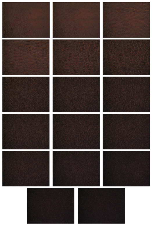Que se passe-t-il si on décide d’augmenter progressivement la tension de 0 à 50 V ? Et bien le cristal liquide reste sensiblement inchangé jusqu’à environ 5-6 V, puis sa texture change progressivement pour donner des sortes de petites gouttes rectangulaires qui vont peu à peu se mouvoir les unes dans les autres de plus en plus rapidement au fur et à mesure que la tension augmente, provoquant l’aspect de noirceur observé.