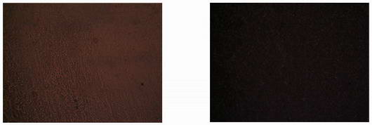 De la même façon, une fois placé sur la platine du microscope, avec une prise de vue selon un angle différent, l’opacité du film de cristaux liquides est bien visible.
