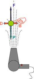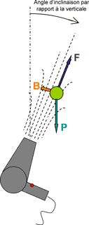 - Si maintenant on incline légèrement le flux d'air, la balle reste dans le flux, sans tomber. Dans ce cas, la balle est soumise à 3 forces : son poids (qui est toujours le même, P), les frottements de l'air sur elle (F), et une force (B) due à la différence de pression entre l'axe du flux d'air et l'endroit où se trouve la balle.
