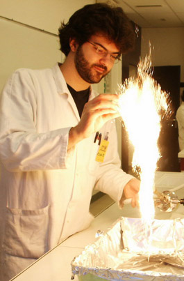Combustion de la poudre de fer dans la flamme d'un chalumeau. Crédit photo : © 2006 S. Querbes pour Anima-Science et Les atomes crochus.