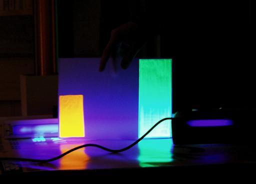 Les UV d'un tube de lumière noire sont convertis en lumière visible, jaune ou verte par les substances contenues dans les feutres.
