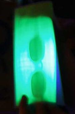 Lunettes disposées entre la source UV et la feuille fluorescente : on distingue une ombre ce qui montre que les UV sont absorbés par les verres.
