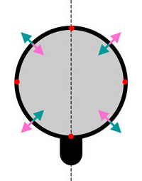 - Or les modes normaux, par définition, sont orthogonaux. Ceci explique pourquoi les nœuds de vibration (en rouge sur les schémas) du premier mode correspond aux ventres de vibration (en vert et rose) du second mode (et inversement). D'où le fait que les positions entre les deux notes pures des deux modes soient décalés de 45° par rapport au pseudo-axe du mug.