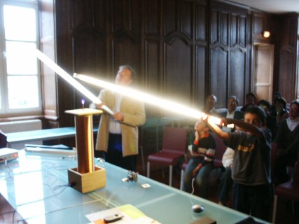Le générateur est tout à gauche de la table, la bobine secondaire est au premier plan. Le public est invité à approcher un tube néon. "Que la force soit avec toi !"